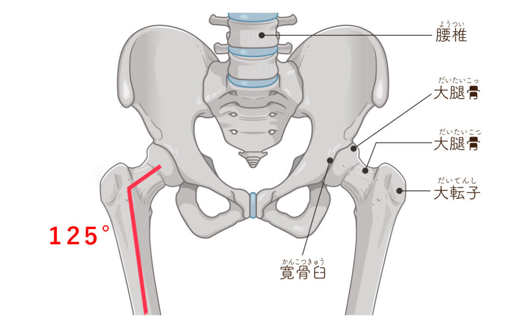 大腿骨の骨幹部と、大腿骨頸部そして骨頭の角度は、一般的には125度と言われています。ただ、この角度が深い人もいれば、浅い人もいます。さらに、内側にねじれが入っている人、外側にねじれが入っている人もいる。これらが組み合わさって、一人ひとり個性豊かな股関節が生まれているんです。