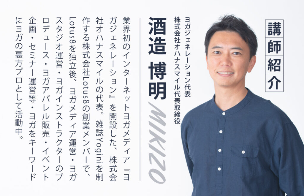 講師を務めるのはもちろん!ヨガビジネスの生みの親であり、ヨガ×仕事という角度で10年以上講師として活動してきたヨガジェネレーション代表 酒造博明(MIKIZO)。ヨガの先生の3人に1人が見ている?!YouTube企画「ヨガの仕事に関する質問に答えます!」シリーズでもお馴染みの人物です。