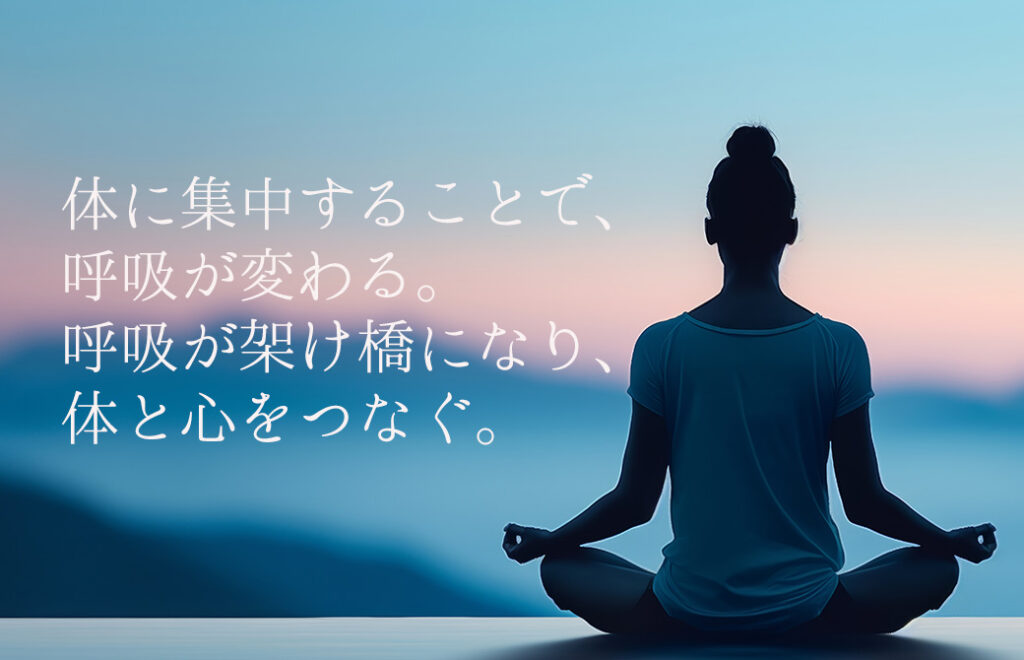 「体と心は繋がっている」ヨガで言われることを、本クラスではより深く体験できるかもしれません。クラスの最初に体にフォーカスするピラティスをすることで、呼吸が深くできるようになります。唯一、自律神経に働きかけることができる呼吸。その呼吸が体と心の架け橋になります。